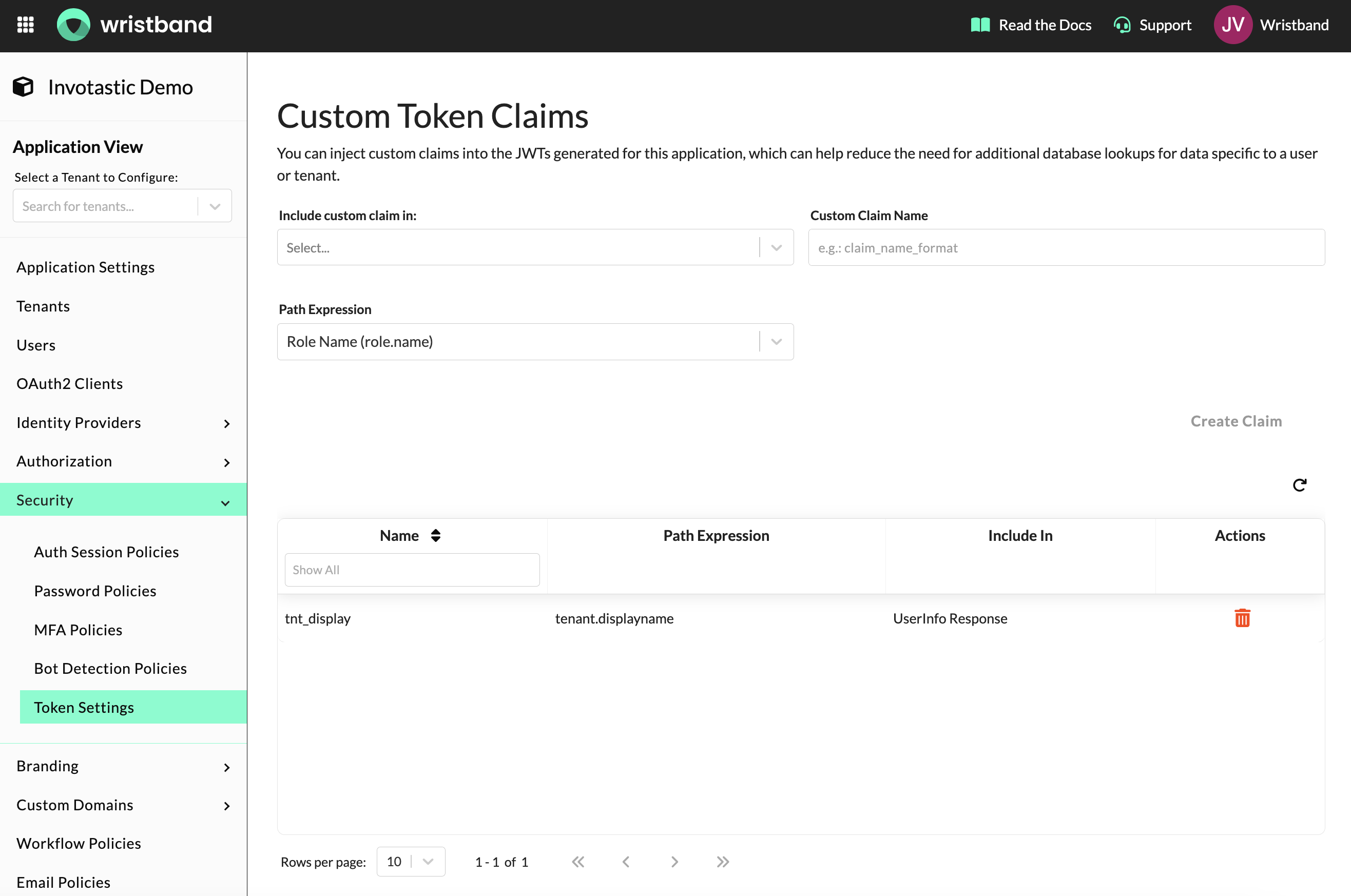 Custom token claims are managed under Security → Token Settings in the Application View of the Wristband Dashboard.