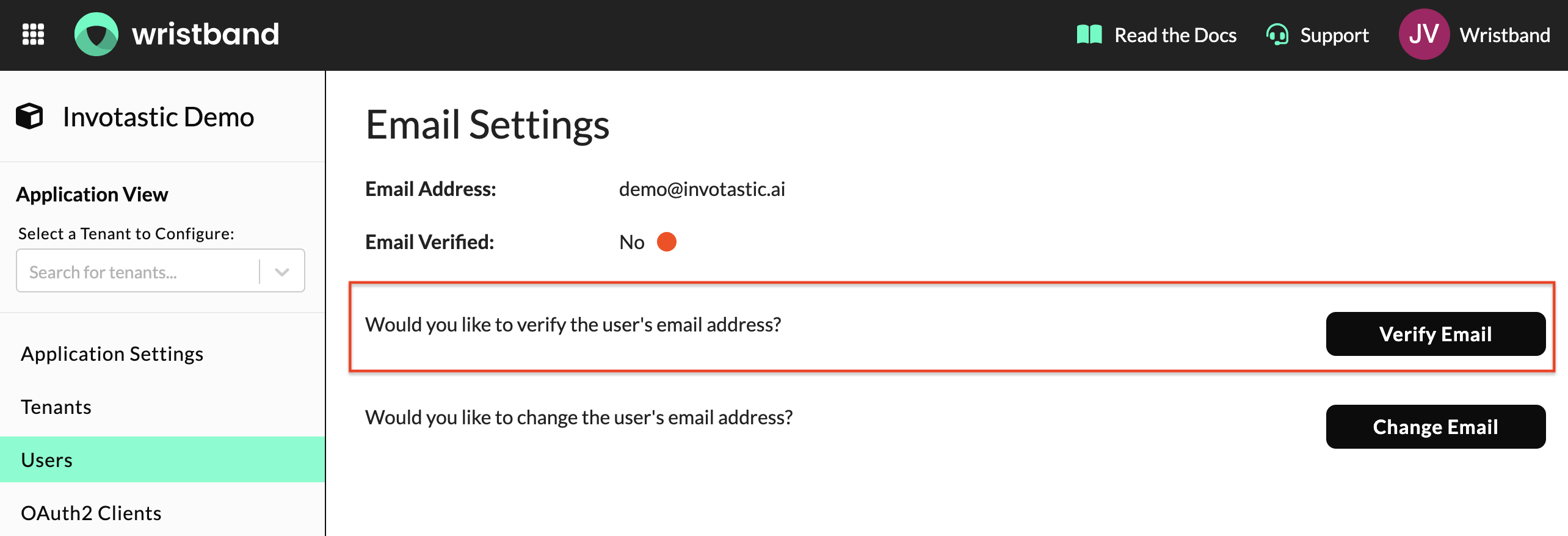 Email Settings on the Edit User page showing the Verify Email button for a user that's pending verification.