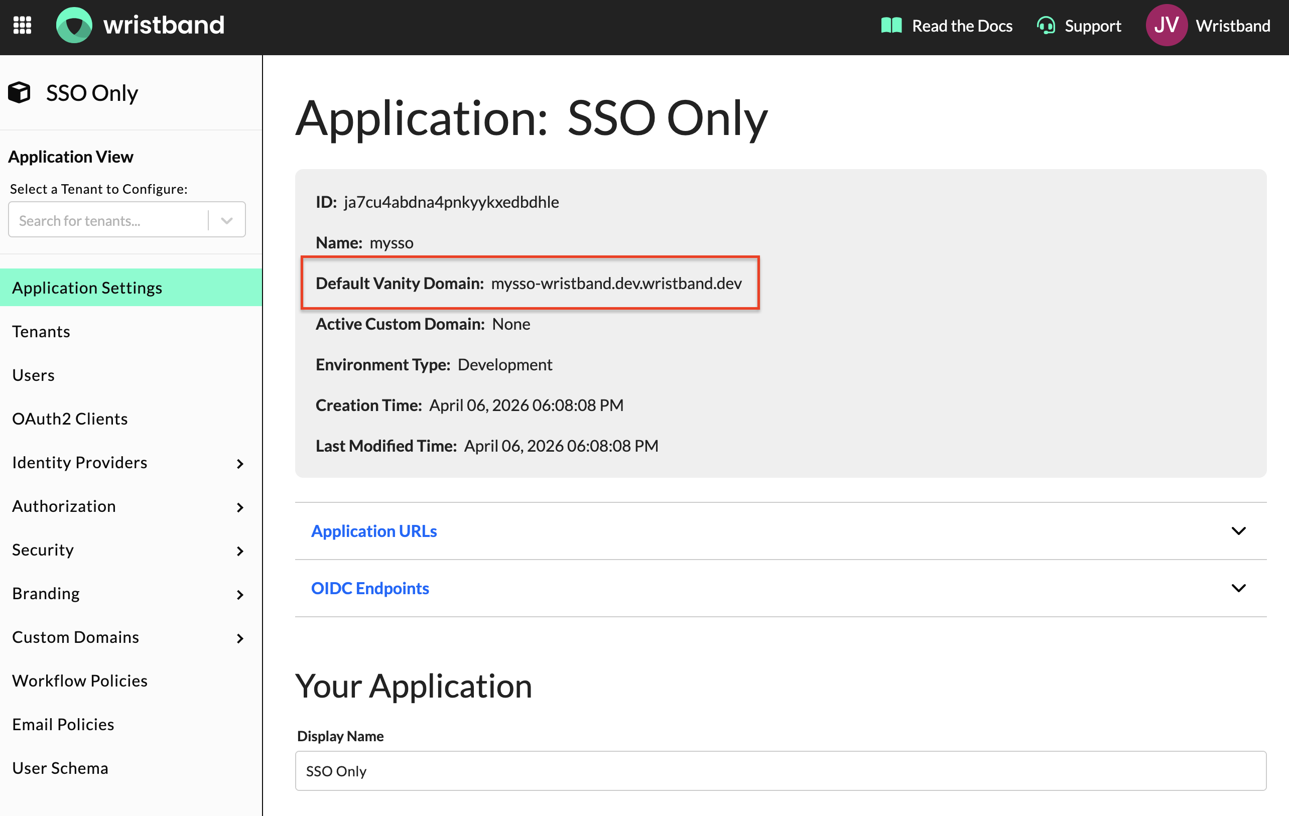 On the Application Settings page you will find your application's Default Vanity Domain. Copy this value and store it — it will be needed when making API calls to Wristband during the SSO flow.