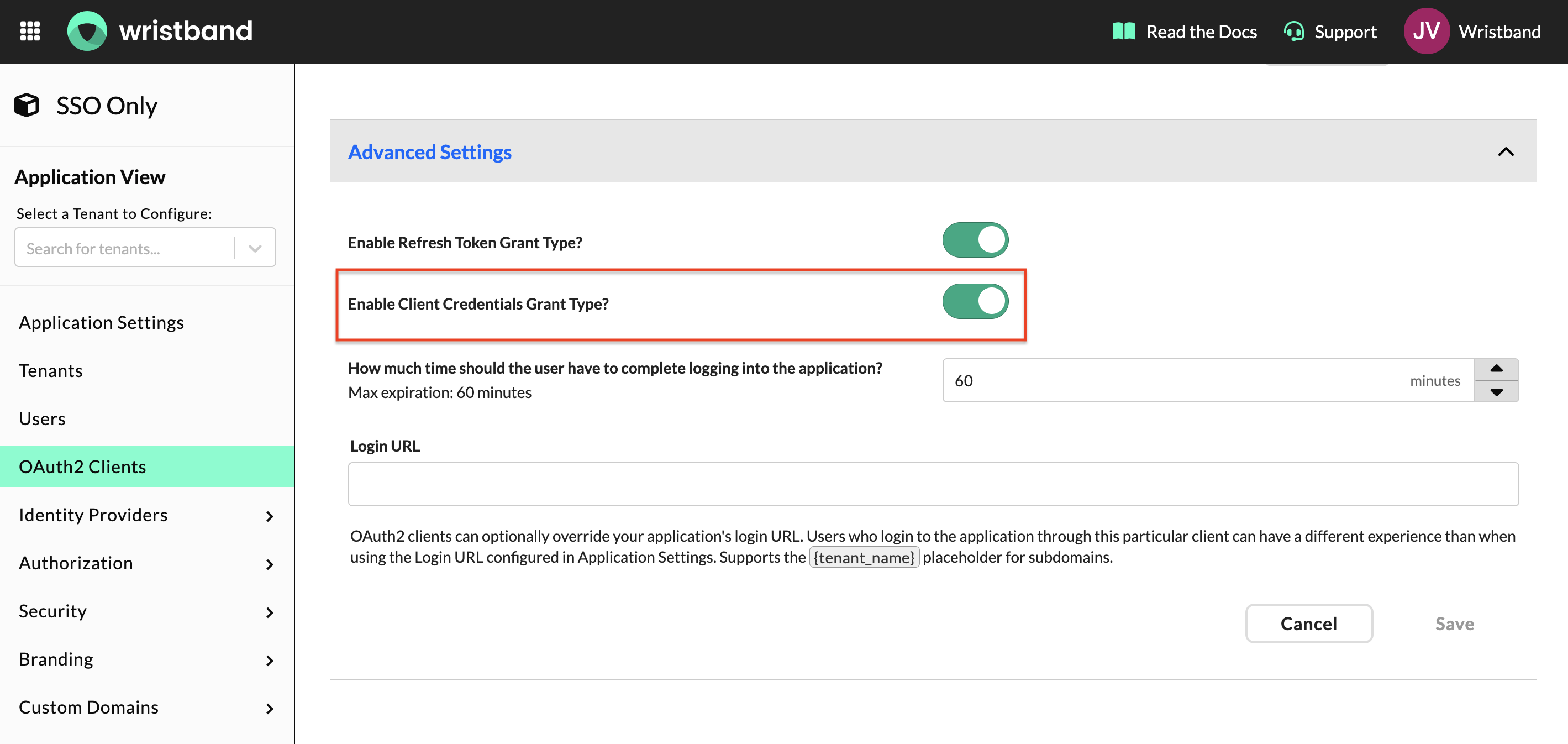 In the Advanced Settings section, enable the Client Credentials grant type. This allows your application to obtain an access token using its Client ID and Client Secret, which is required for making authenticated API calls to Wristband during the SSO flow.