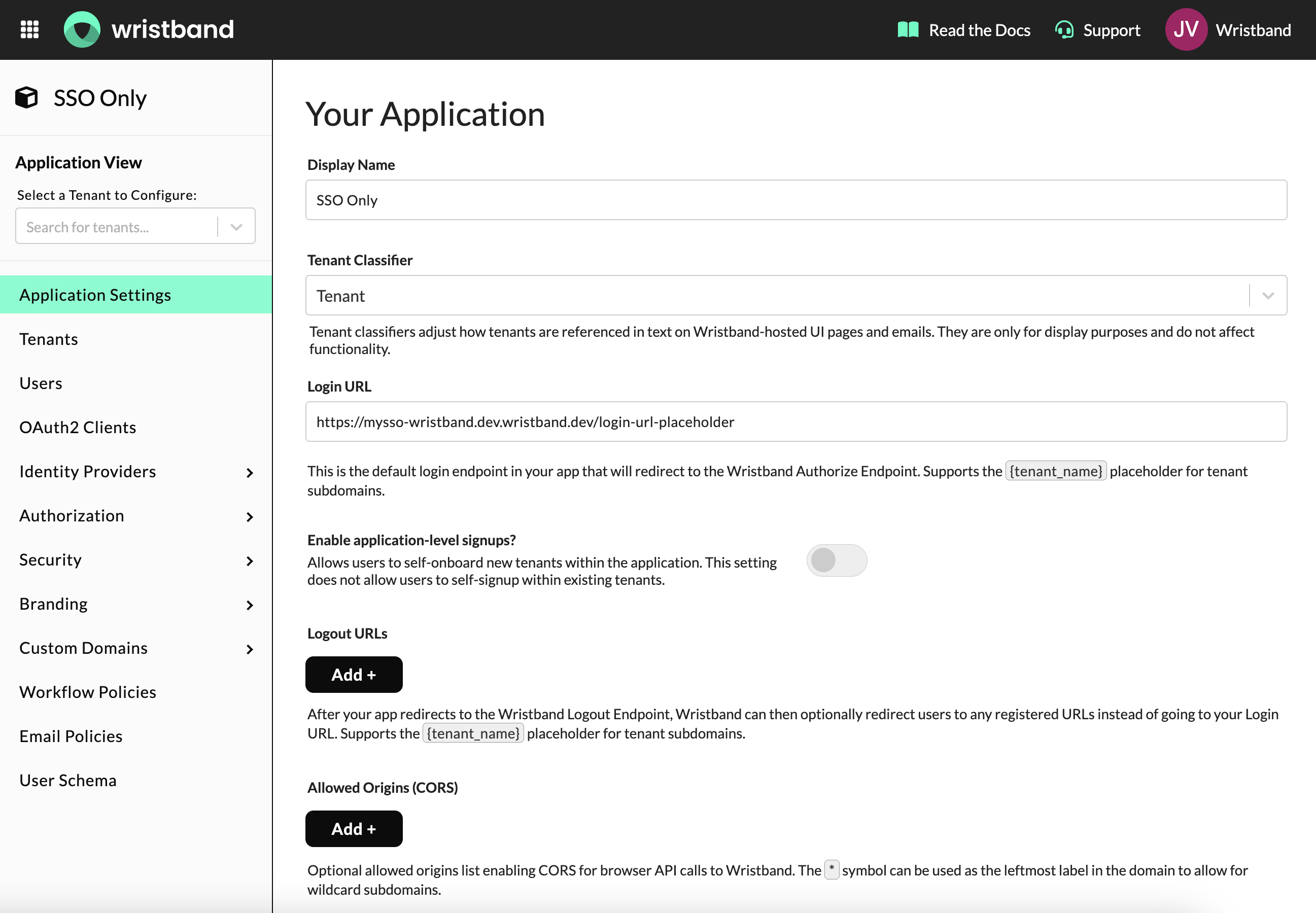 From the Wristband dashboard, create a new manual application. Once created, navigate to the "Application Settings" side navigation menu.