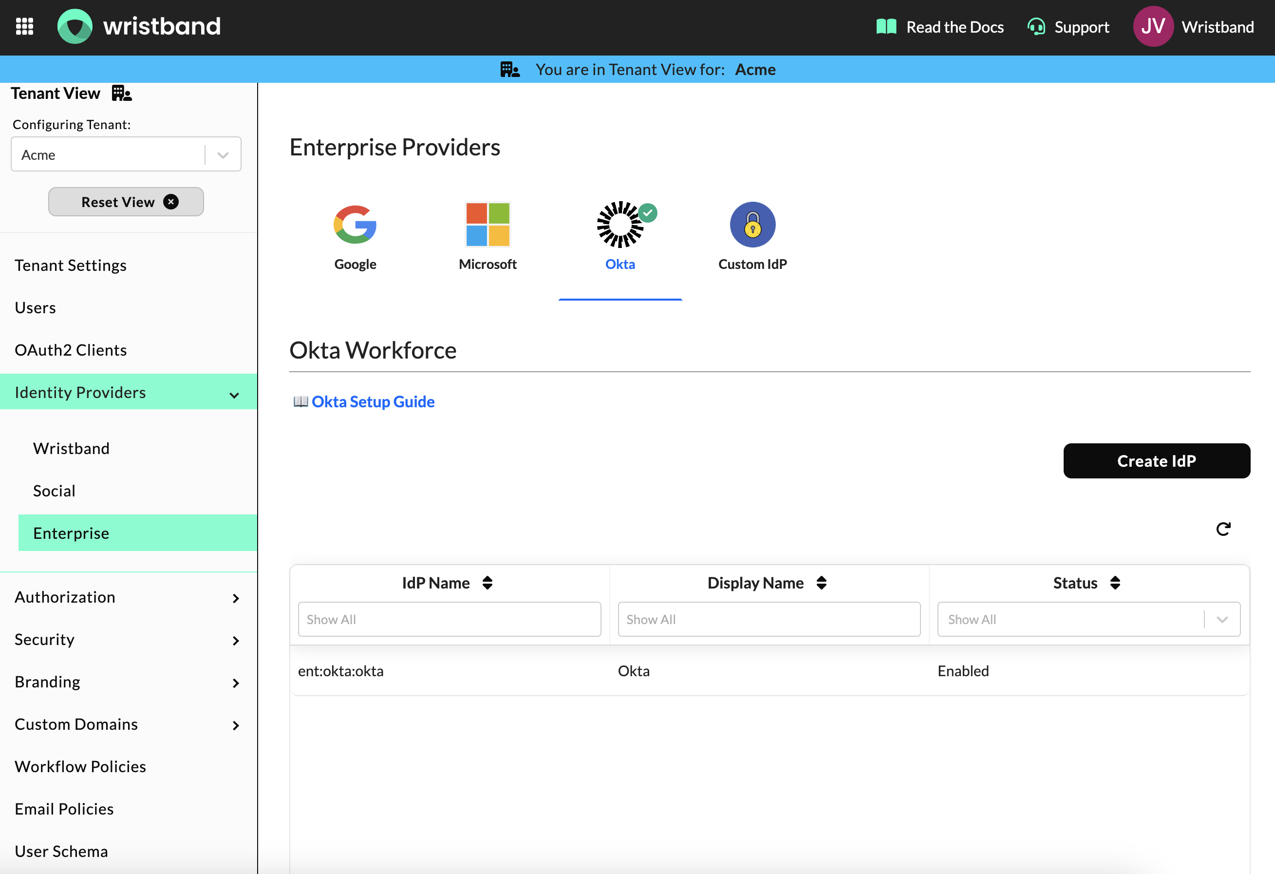 Navigate to Identity Providers > Enterprise and add an enterprise IdP for your customer's SSO provider (e.g. Okta, Azure AD). Follow the relevant setup guide in the Wristband documentation for how to configure both sides of the connection.