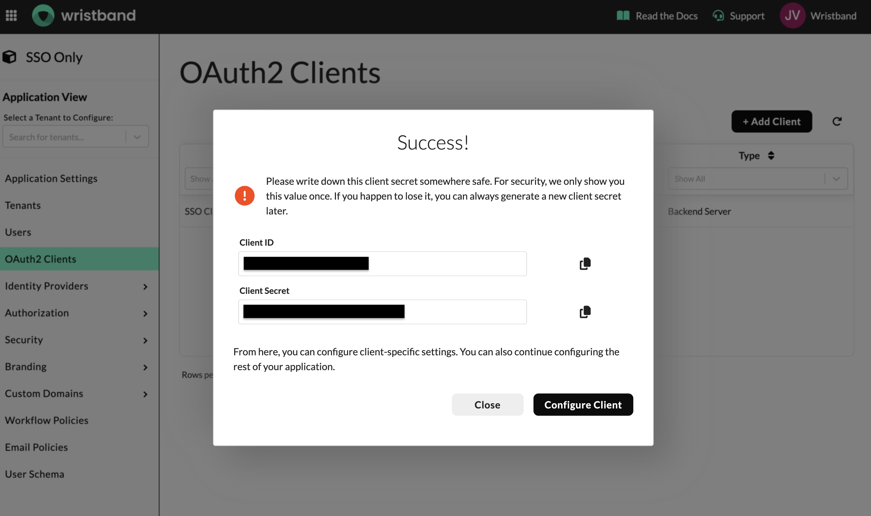 Upon creation, your Client ID and Client Secret will be displayed. Copy these values and store them securely — the Client Secret is only shown once. These credentials are used to obtain an access token for making authenticated API calls to Wristband during the SSO flow.