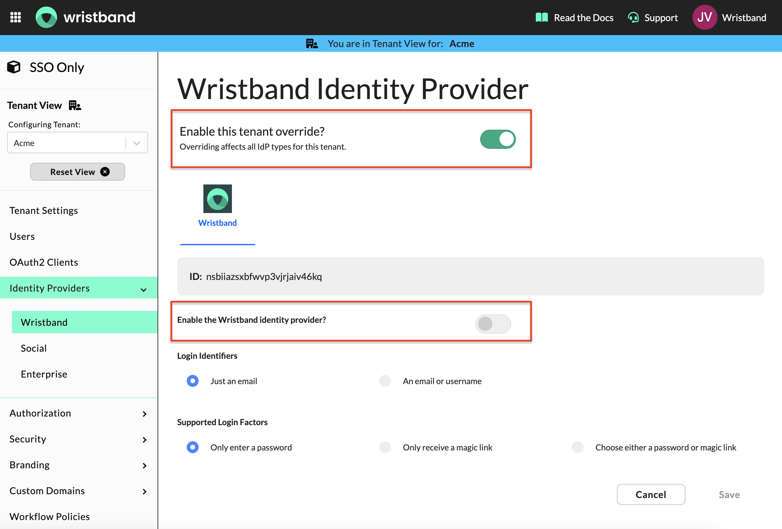 From the Tenant View, navigate to Identity Providers > Wristband in the left side navigation and enable the tenant-level IdP override toggle at the top of the page. This overrides the default app-level IdP settings specifically for this tenant, allowing each tenant to have its own IdP configuration.