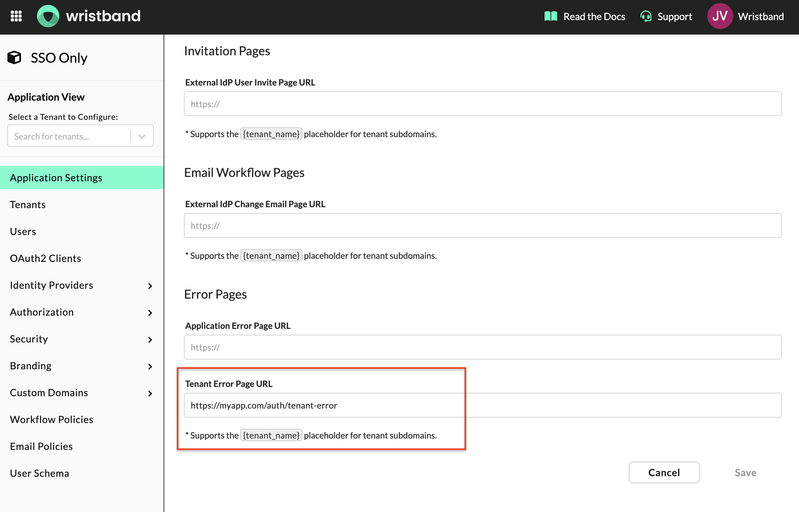 https://myapp.com/auth/tenant-error.NOTE: If you only need visual customization without custom logic, you can alternatively configure page branding in the Wristband dashboard to match your brand instead of using this URL.