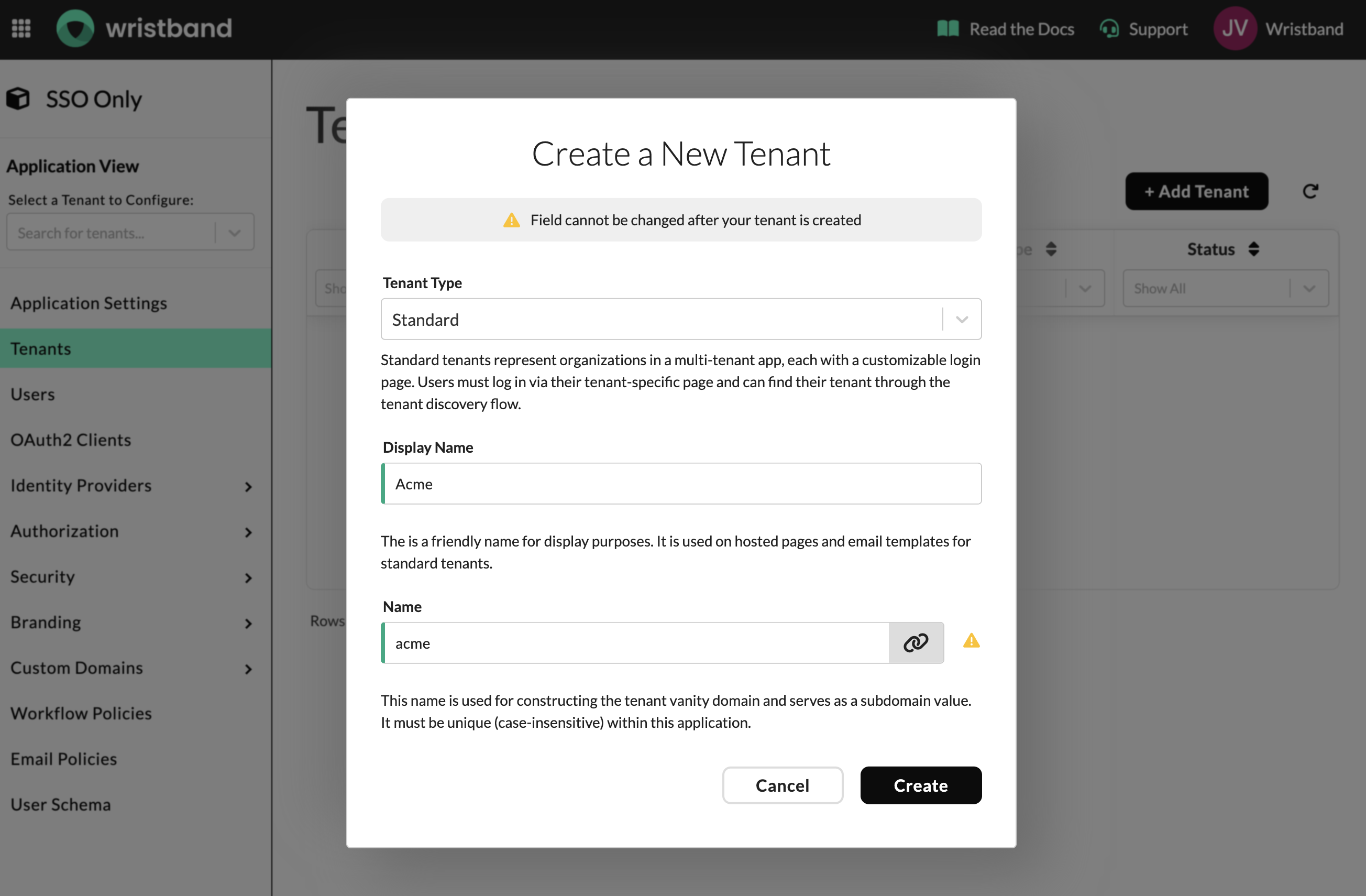 - Name: This value is used to generate the tenant's vanity domain, which is used when redirecting to the Wristband Authorize endpoint.