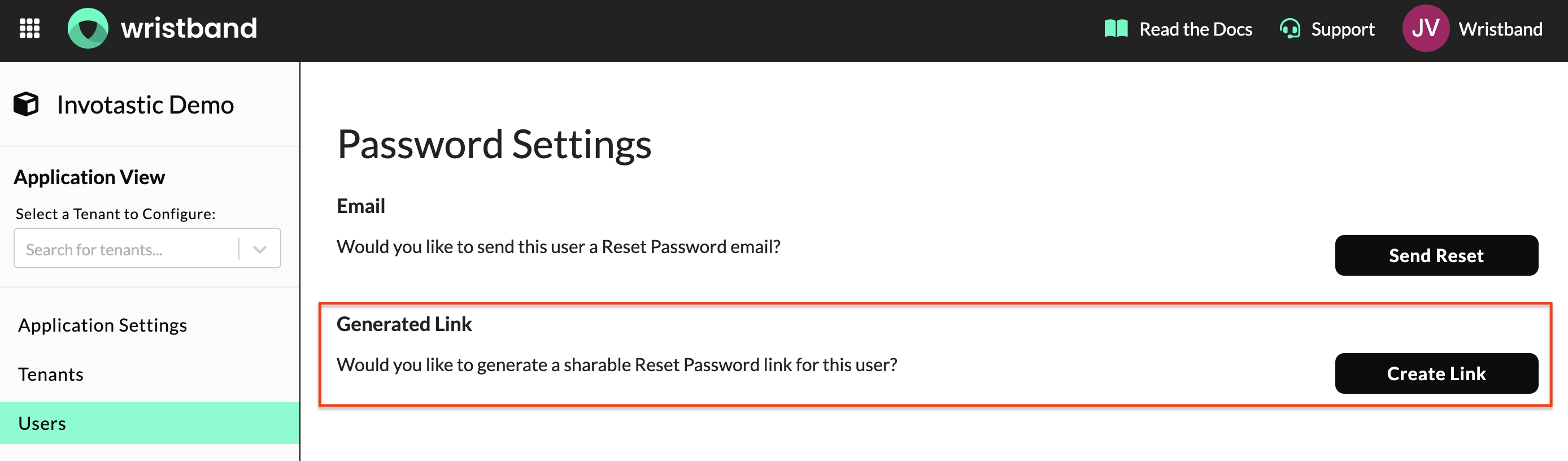 Create Link button on the Edit User Page in the Wristband dashboard