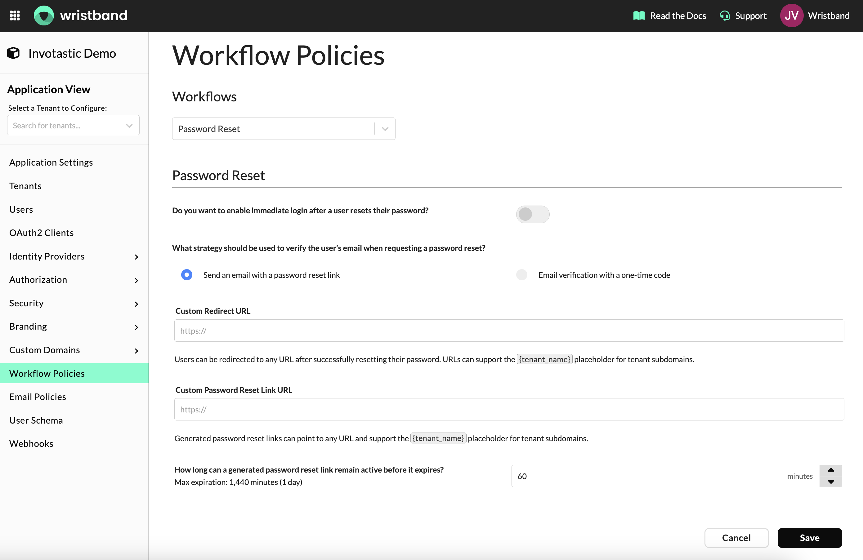 Password Reset Workflow Policies in the Wristband Dashboard