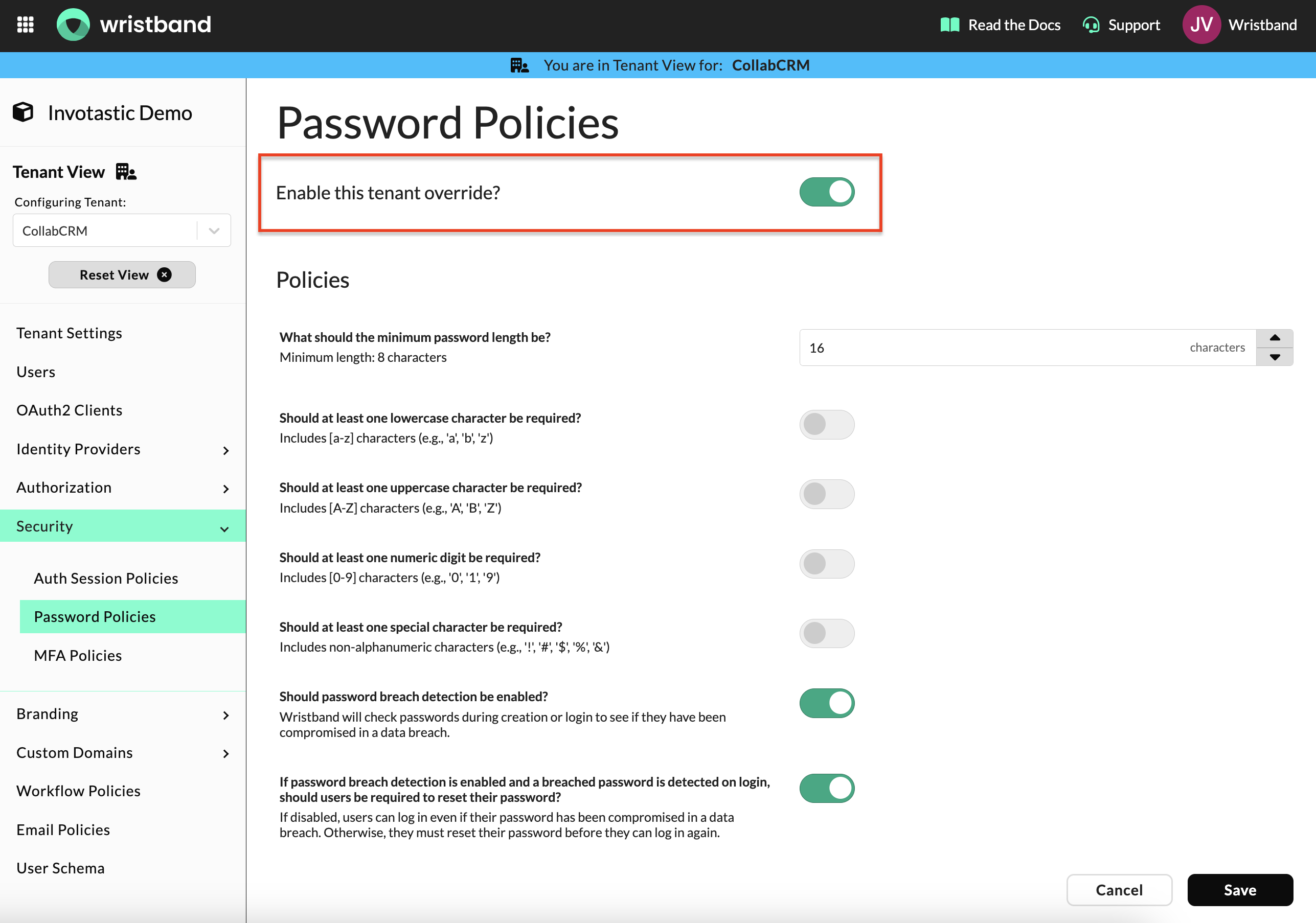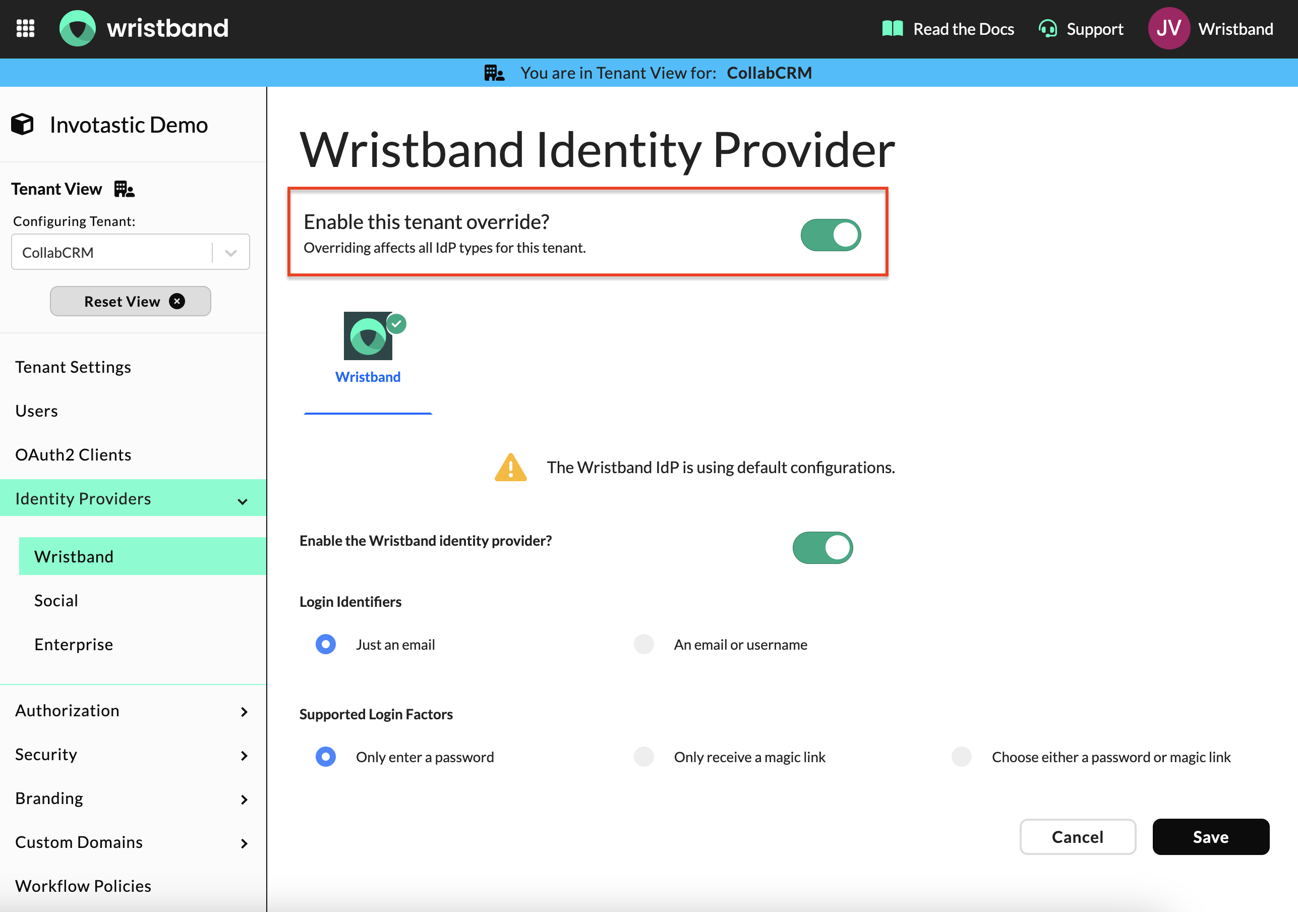 Important: Enabling the tenant override affects all IdP types for that tenant, not just the Wristband IdP.