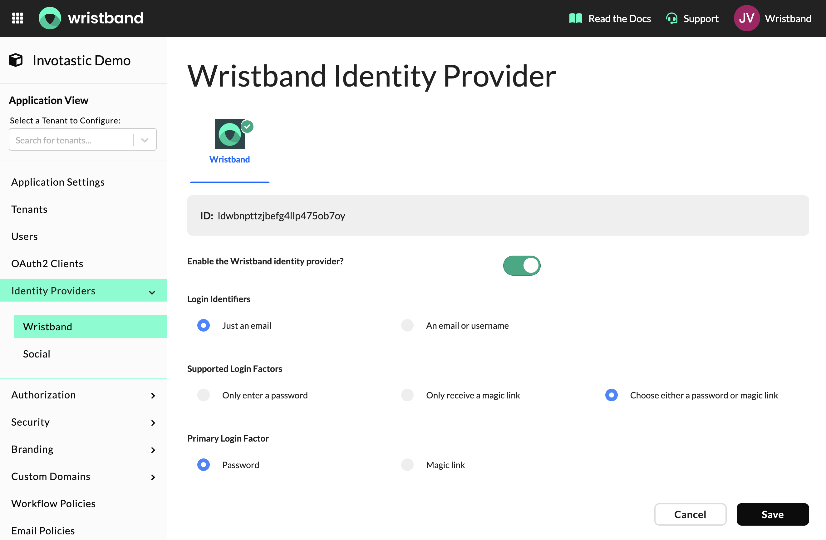 Password login is configured under Identity Providers → Wristband in the Application View of the Wristband Dashboard. The Supported Login Factors setting controls which login method is presented to users.