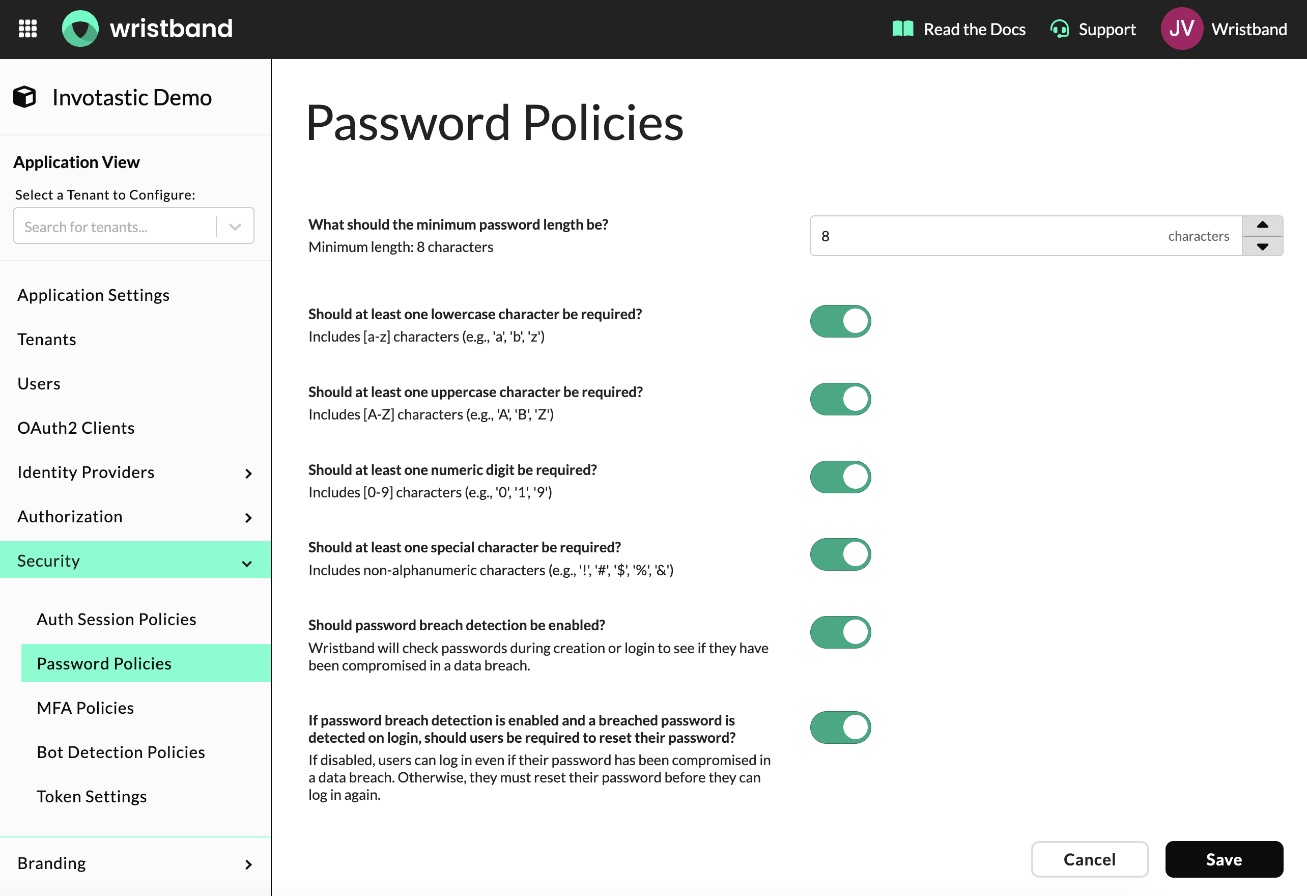!,#,$,%,&). - Password Breach Detection: When enabled, Wristband checks passwords during creation and login against known data breaches. It is recommended to keep this enabled.