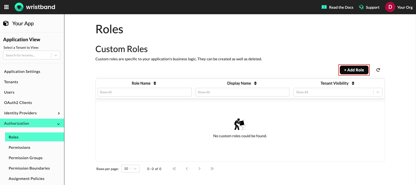If you don't want to create your own role, you can instead use one of Wristband's predefined roles. These roles contain common sets of permissions that are useful for testing purposes. For example, the Application Admin Client role contains permissions to manage all resources under an application.